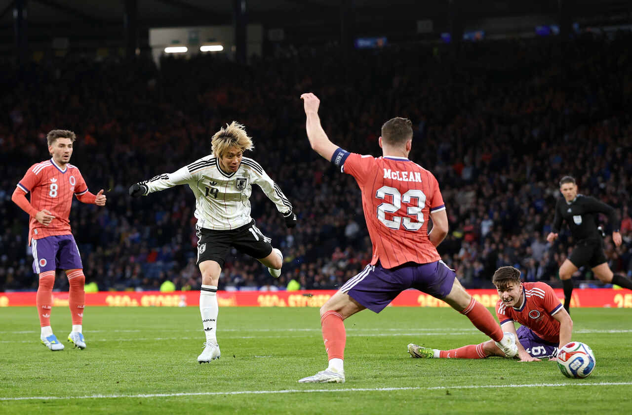 As comissões técnicas optaram por fazer observações em larga escala neste amistoso: o Japão trocou todos os jogadores de linha escalados como titulares, e a Escócia promoveu diversas mexidas. No primeiro tempo, o Japão mostrou mais iniciativa ofensiva e criou as oportunidades mais perigosas. A Escócia, mesmo atuando em seus domínios, conseguiu apenas duas finalizações — uma delas, de McTominay, explodiu na trave. Os visitantes, por outro lado, arriscaram 11 vezes e também acertaram o poste em chute de Tanaka, mas o placar permaneceu zerado até o intervalo.