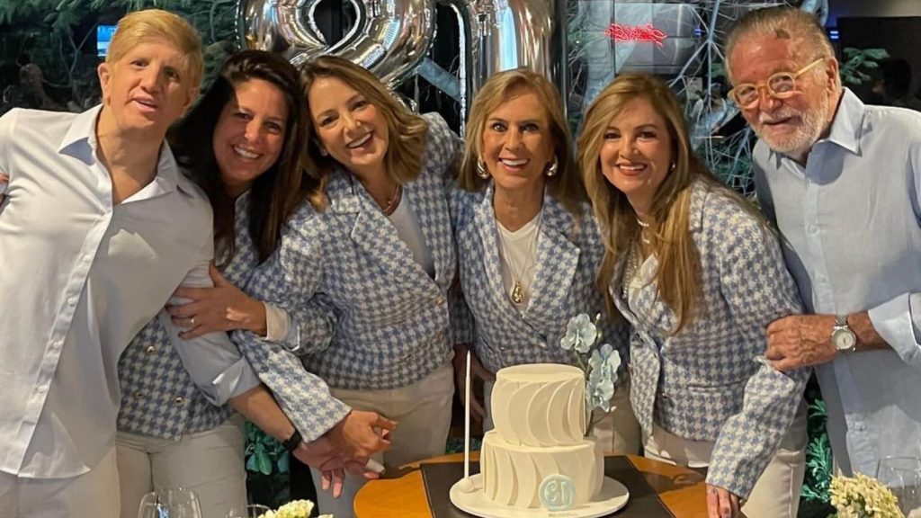 Seguindo os passos da mãe, Ticiane Pinheiro, 48, também trabalhou como modelo. Hoje, ela atua no time de apresentadores da Record TV. Casada com o jornalista César Tralli, ela é mãe de duas meninas: Manuela, que nasceu em 2019, fruto do casamento com o apresentador, e Rafaella, 15 – da relação antiga com Roberto Justus.