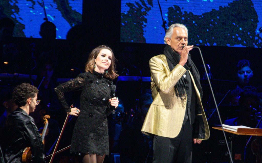 Sandy subiu ao palco para cantar uma de suas músicas, “Amor Não Testado” e, posteriormente, realizou o dueto de “Vivo por Ella“, lançada em 1997, com o cantor italiano. Essa é a segunda vez que a artista brasileira se apresenta com Bocelli durante sua passagem no Brasil. No dia 18 deste mês, ela participou de seu conserto em Belo Horizonte, Minas Gerais.