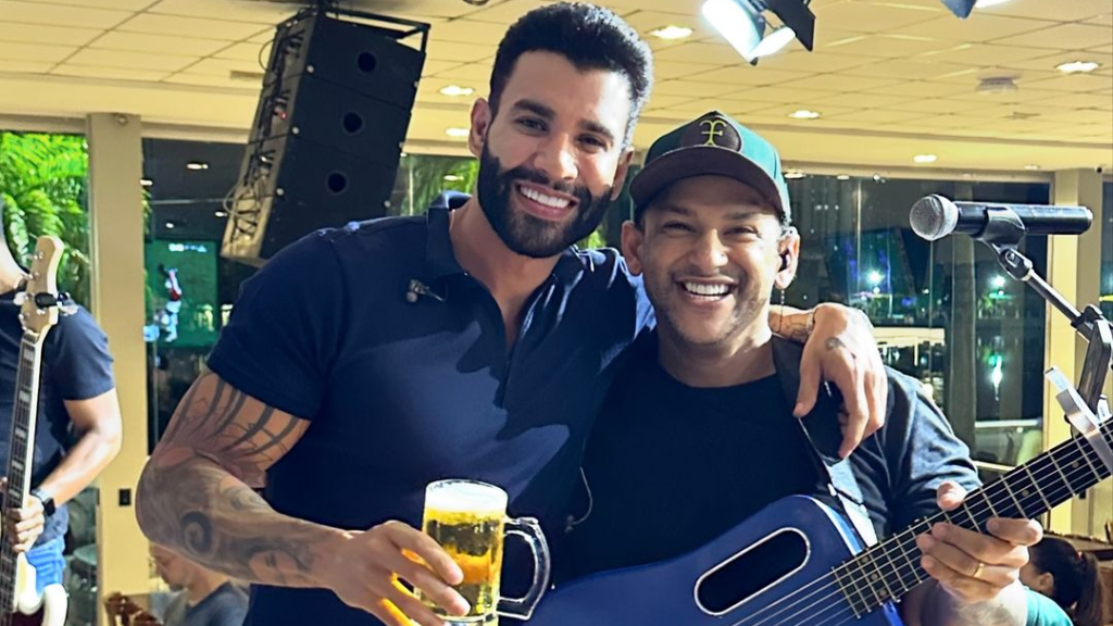 Gusttavo Lima fez uma aparição surpresa nesta terça-feira (8) em um bar na cidade de Campina Grande, na Paraíba. O artista dividiu palco com Gegê Bismarck, cantor que fez uma publicação nas redes sociais falando que estava honrado por ter se apresentado com seu ídolo.