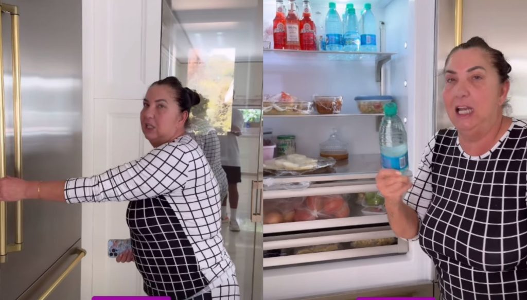 “A geladeira não gela! Essa água está aqui desde ontem, pega nessa água”, disse indignada, entregando uma das garrafas na mão da influenciadora. “Tem que vir [alguém para] colocar essa geladeira para funcionar ou, então, arrancar ela daqui e trazer outra”, afirmou Margareth.