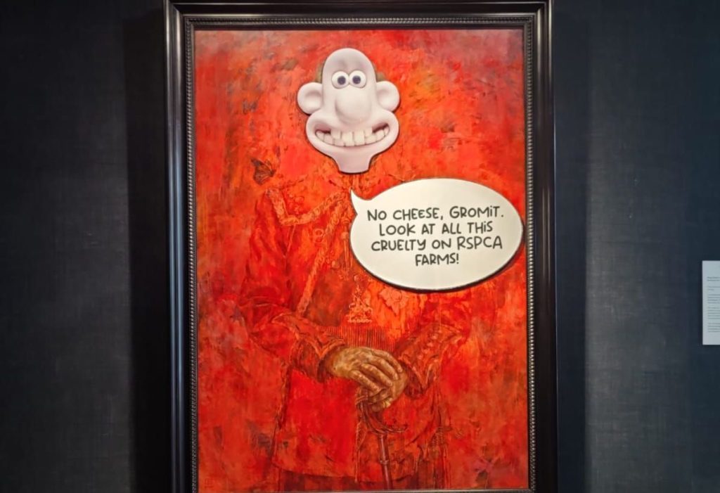 Os ativistas cobriram a cabeça do rei com uma placa do personagem de desenho animado britânico Wallace, da série de comédia “Wallace e Gromit”. Um balão de fala foi então colado na pintura com a seguinte legenda: “Sem risadinha, Gromit, veja toda essa crueldade nas fazendas da RSCPA”.
