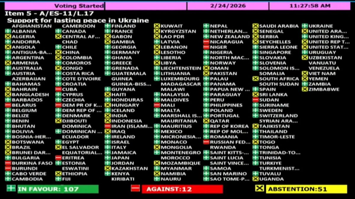 O Brasil e os Estados Unidos se abstiveram nesta terça-feira (24) na votação da Assembleia Geral da Organização das Nações Unidas (ONU) de uma resolução sobre apoio a uma paz duradoura na Ucrânia. No geral, o texto foi aprovado por 107 votos a favor, 12 contra e 51 abstenções. A resolução não é juridicamente vinculante, mas tem peso político no âmbito das Nações Unidas.
