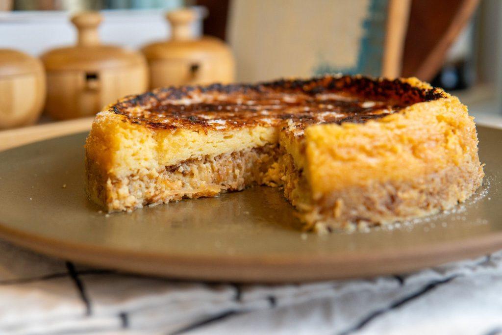 É um ponto perfeito entre pudim e bolo, mas com cara de sobremesa de avó que voltou de Paris.