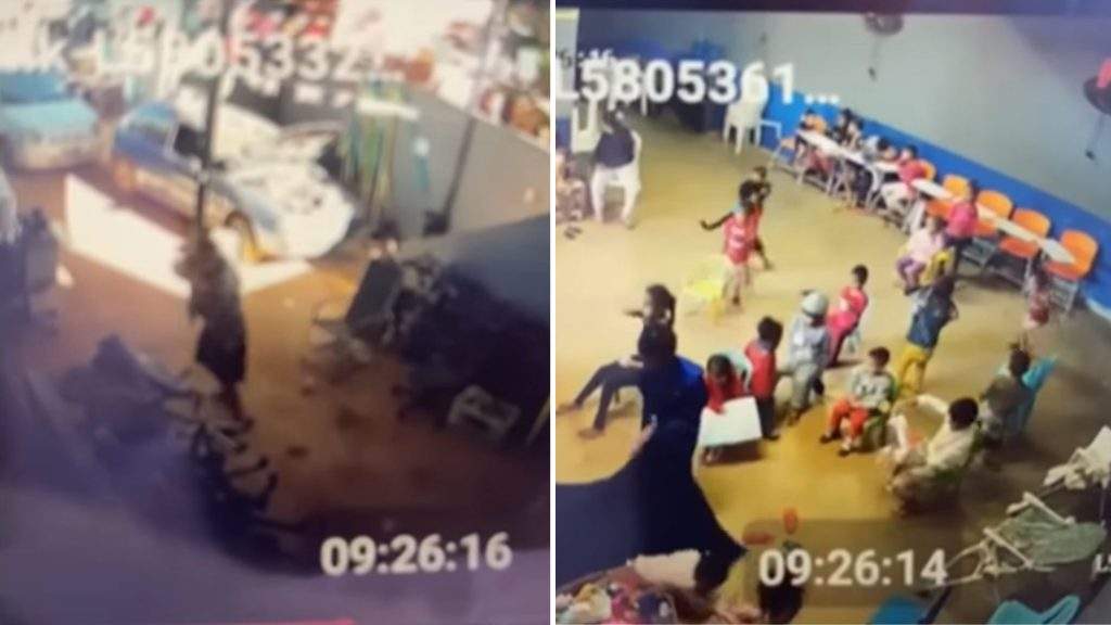 Uma câmera de segurança registrou o momento da invasão e o desespero das monitoras e das crianças.
