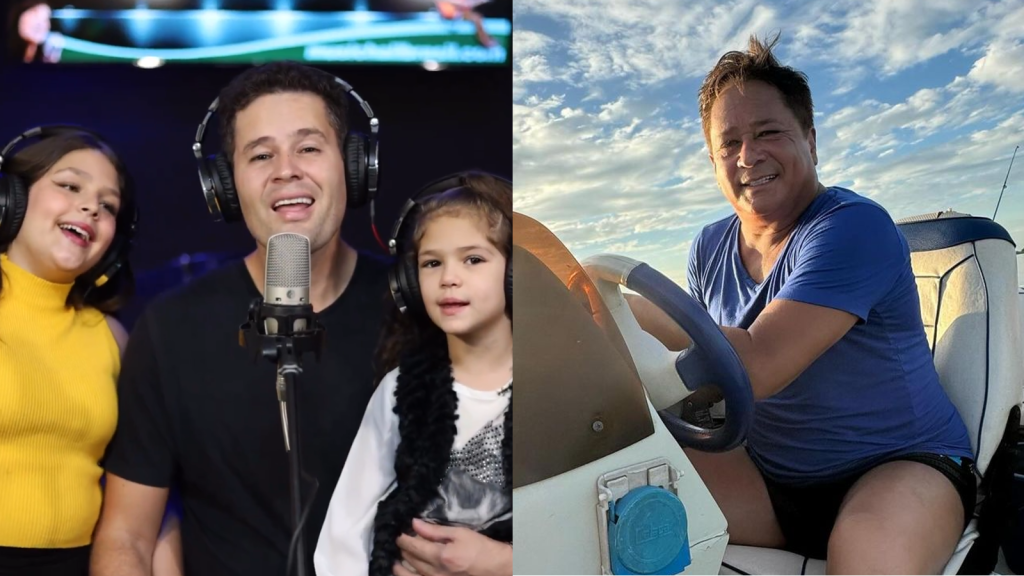 Pedro Leonardo, 37, fez uma homenagem ao pai, Leonardo, que completa 61 anos nesta quinta-feira (25). O apresentador cantou a música “Pense em Mim” com as filhas Maria Vitória, 13, e Mavie, 6.