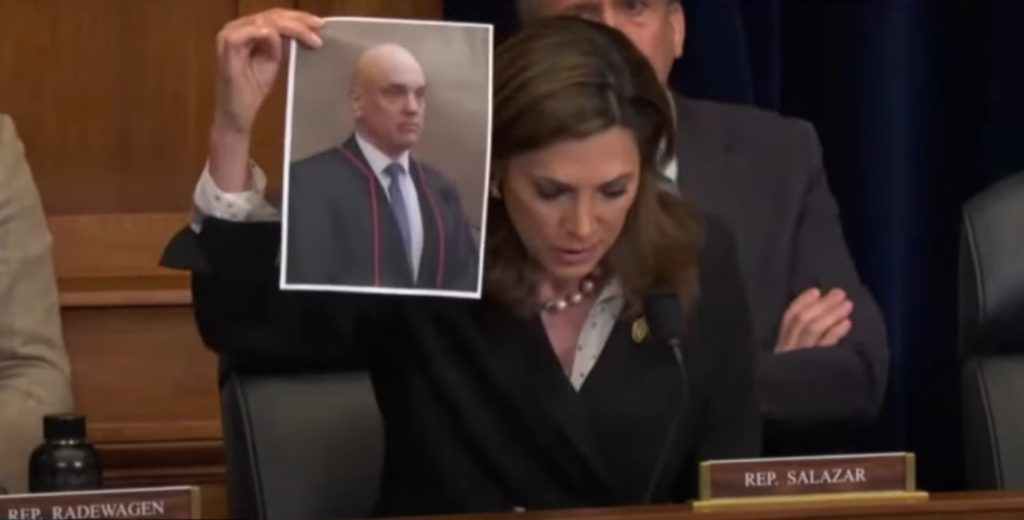 Em maio, a deputada norte-americana María Elvira Salazar chamou o presidente Luiz Inácio Lula da Silva de “condenado por corrupção” e classificou o ministro Alexandre de Moraes, do Supremo Tribunal Federal (STF), como “operador totalitário” da justiça brasileira.