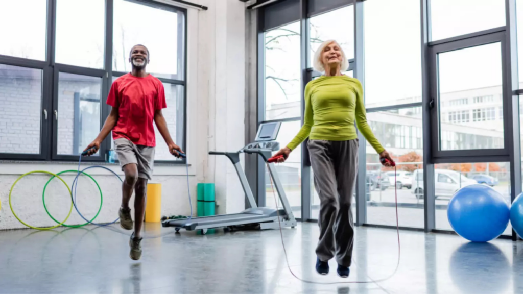 Idosos devem seguir orientações semelhantes às dos adultos, respeitando seus limites. Exercícios moderados também podem variar entre 150 e 300 minutos semanais.
