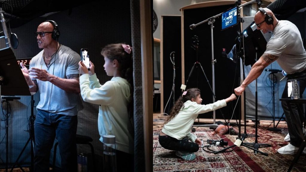 Nas imagens, enquanto The Rock grava suas falas, Jasmine Johnson, 8, observa o pai, além de fazer alguns registros durante o trabalho do artista.