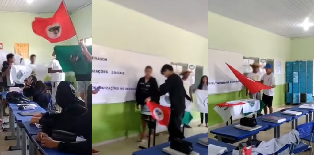 Vídeos publicados nas redes sociais mostram alunos da Escola Família Agrícola de Pinheiros, no Espírito Santo, realizando uma apresentação em sala de aula com bandeiras do Movimento dos Trabalhadores Rurais Sem Terra (MST). No registro, eles dançam e cantam uma das músicas do grupo invasor, Bandeira de Luta.