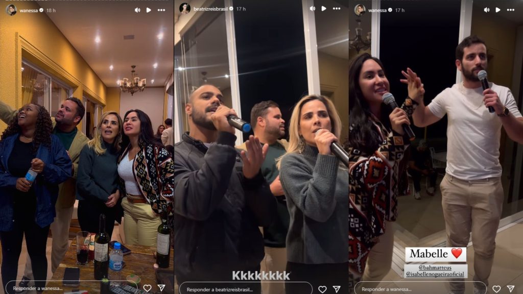 Os ex-BBBs Isabelle Nogueira, Matteus Amaral, Beatriz Reis, Marcus Vinicius, Raquele Cardozo, Michel Nogueira e Wanessa Camargo se reuniram na noite do sábado (10) para uma festa com karaokê.