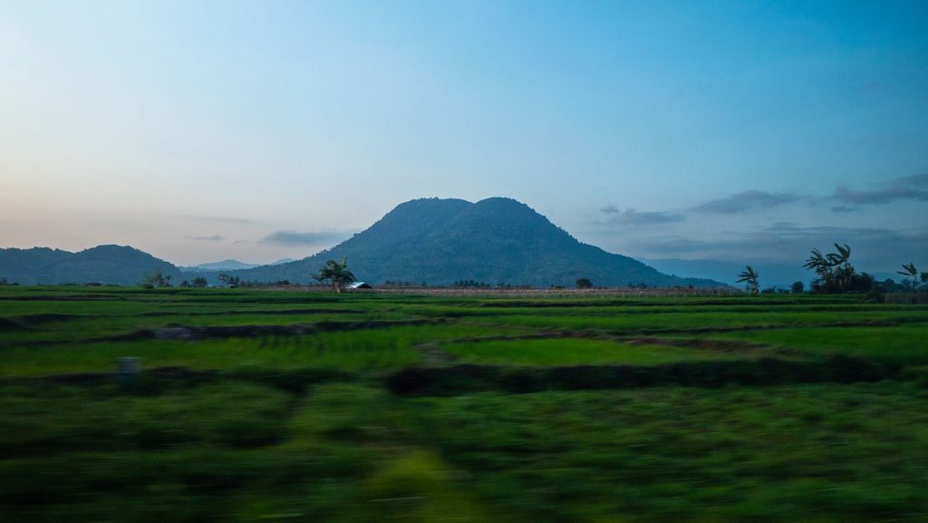 O som ritmado do trem preenche o ambiente enquanto atravessa uma paisagem que parece ser de um cartão-postal na Indonésia. Campos de arroz exuberantes dão lugar a florestas densas, com rios brilhando sob o sol da manhã.