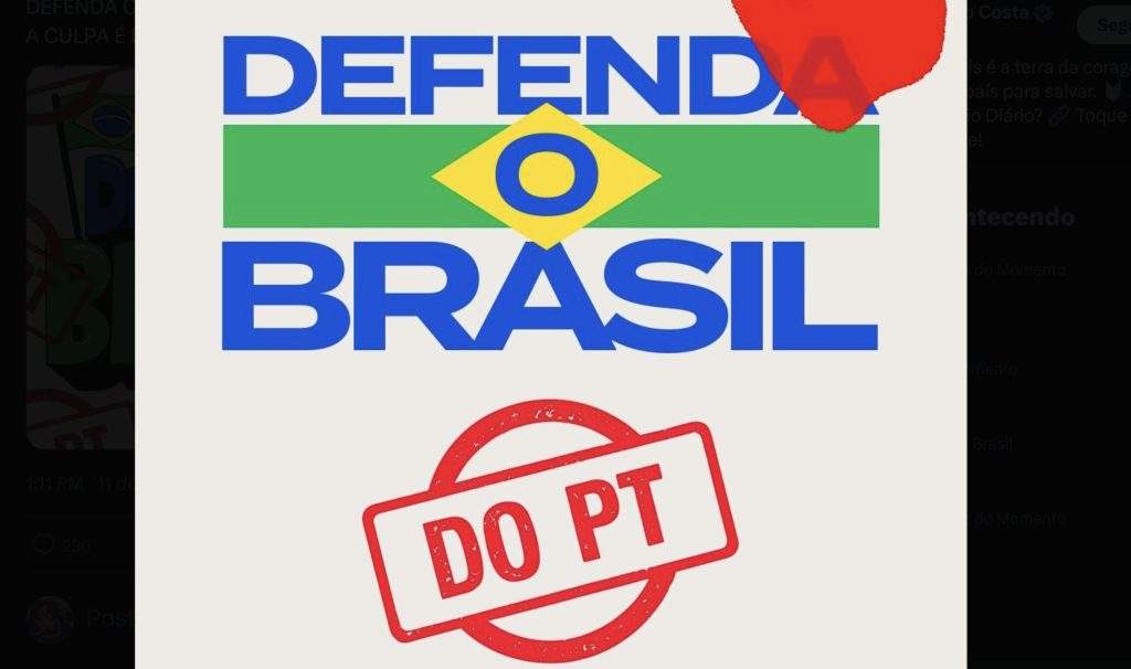 Internautas impulsionaram, nesta sexta-feira, 11, o slogan “Defenda o Brasil do PT” na rede social X. A campanha responde à peça publicitária lançada pelo Partido dos Trabalhadores (PT), que culpa o ex-presidente Jair Bolsonaro pelo tarifaço imposto pelos Estados Unidos.