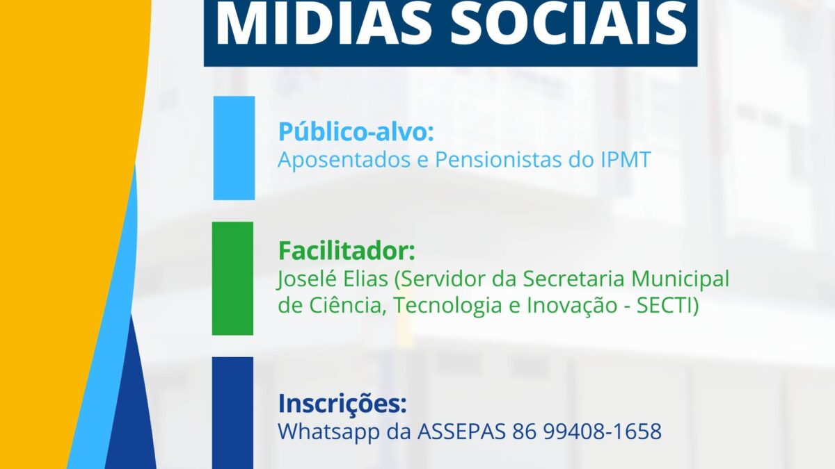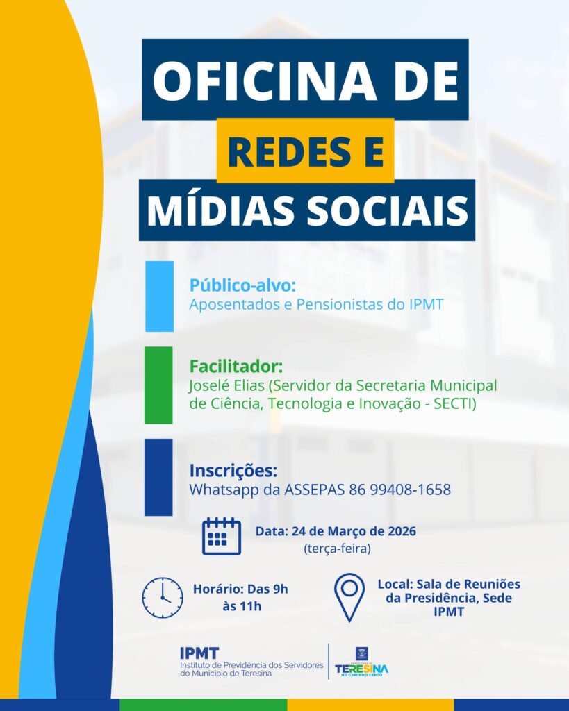 O Instituto de Previdência do Município de Teresina (IPMT), realizará, na próxima terça-feira(24), uma oficina de redes e mídias sociais voltada para aposentados e pensionistas vinculadas ao Instituto. A iniciativa tem como objetivo promover a inclusão digital, ampliando o conhecimento e a autonomia dos participantes no uso das tecnologias.