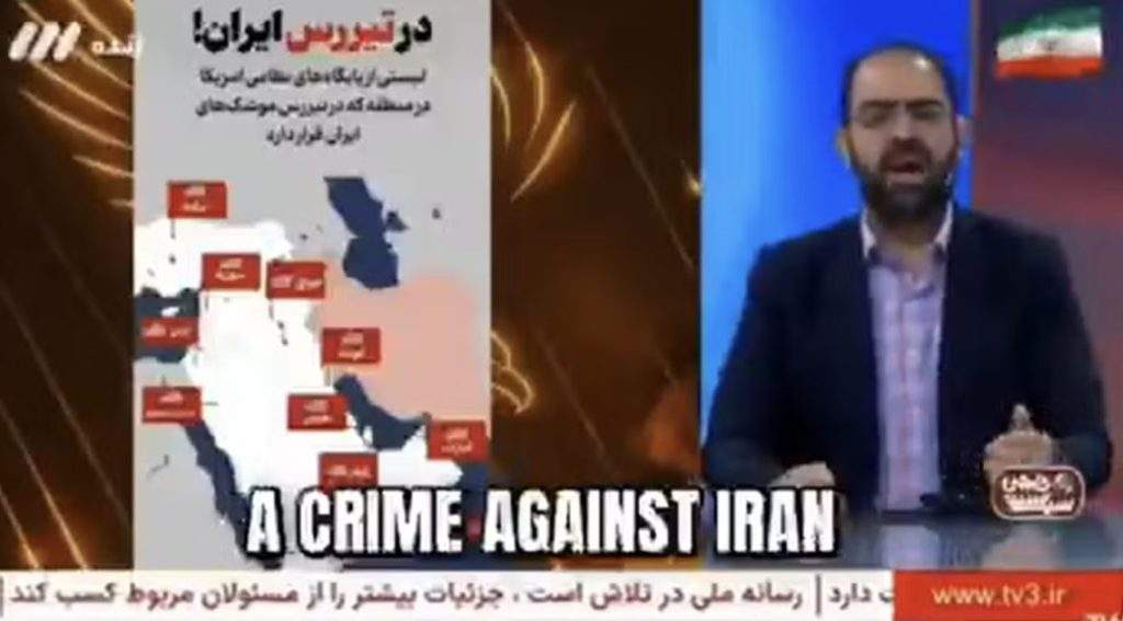 Durante a programação, a emissora exibiu um mapa com o título “Dentro do alcance de fogo do Irã”. O gráfico aponta diversas bases norte-americanas distribuídas pelo Oriente Médio. Além disso, o comentarista lançou um recado direto ao presidente Donald Trump. “Você começou”, disse. “Nós vamos terminar.”