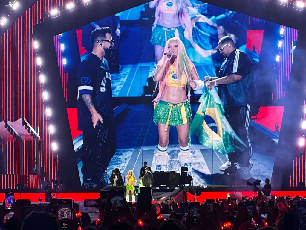 Vestida de verde amarelo, a “Bichota” relembrou quando veio ao Brasil no Carnaval de 2019. Ela também confessou que estava ansiosa para o show e passou a semana inteira aprendendo português para conversar com os fãs.