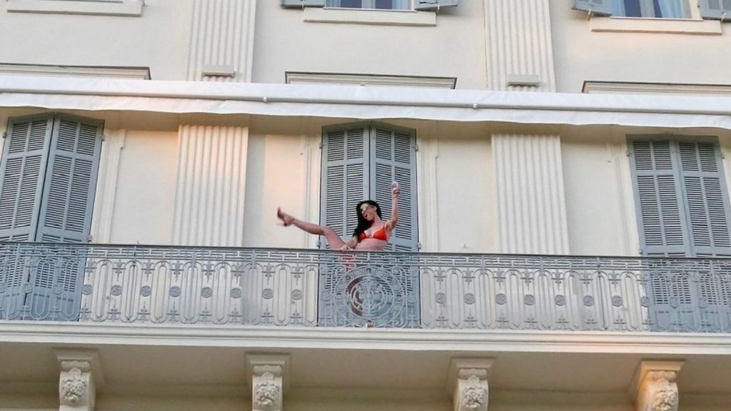 Katy Perry, 39, movimentou as redes sociais na última segunda-feira (4) ao posar de biquíni e salto alto na varanda de um hotel.