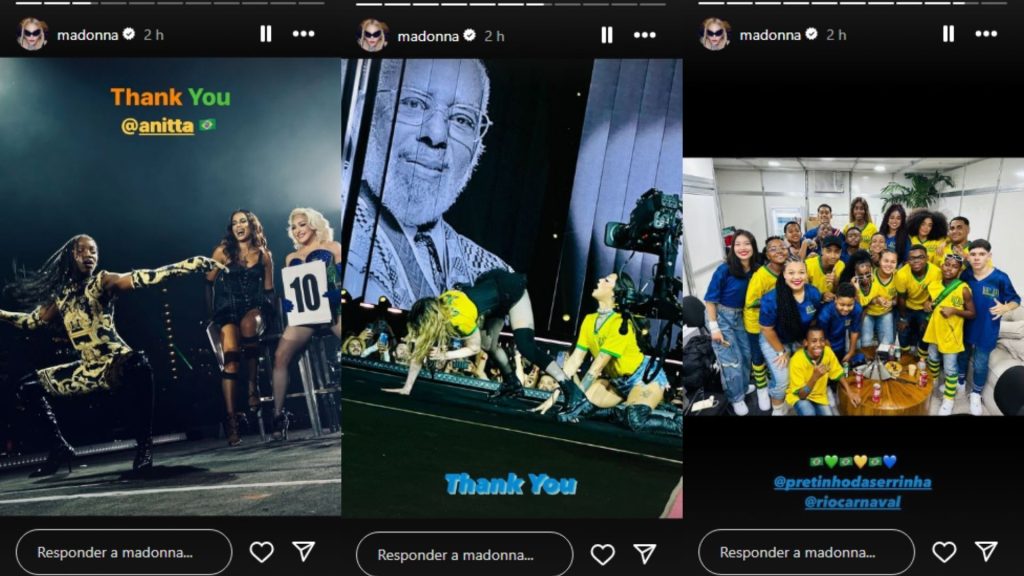 Madonna postou fotos com seus convidados especiais do show na praia de Copacabana de sábado (4): Anitta, Pabllo Vittar e o grupo de ritmistas mirins de escolas de samba comandado por Pretinho da Serrinha.