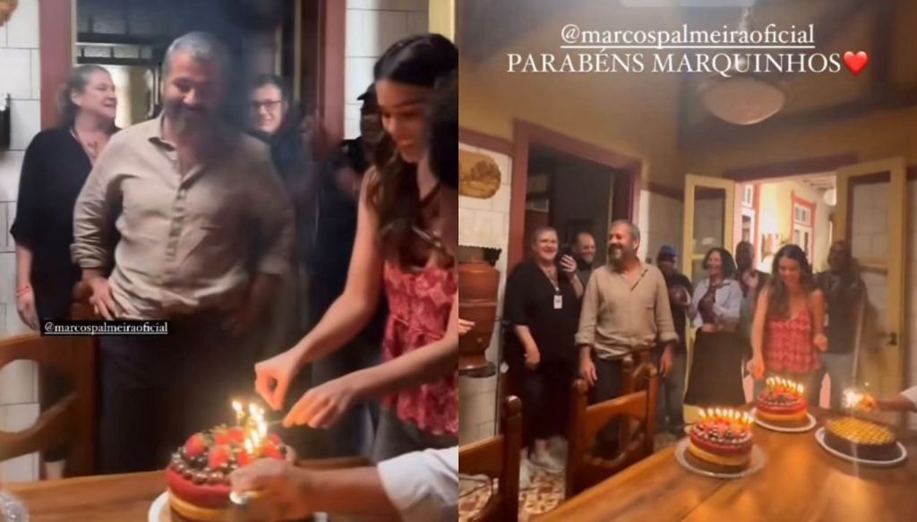 Marcos Palmeira foi surpreendido com uma festa de aniversário nos bastidores do remake de “Renascer”. Ao comemorar 61 anos nesta última segunda-feira (19), o ator ganhou três bolos e muitas parabenizações.
