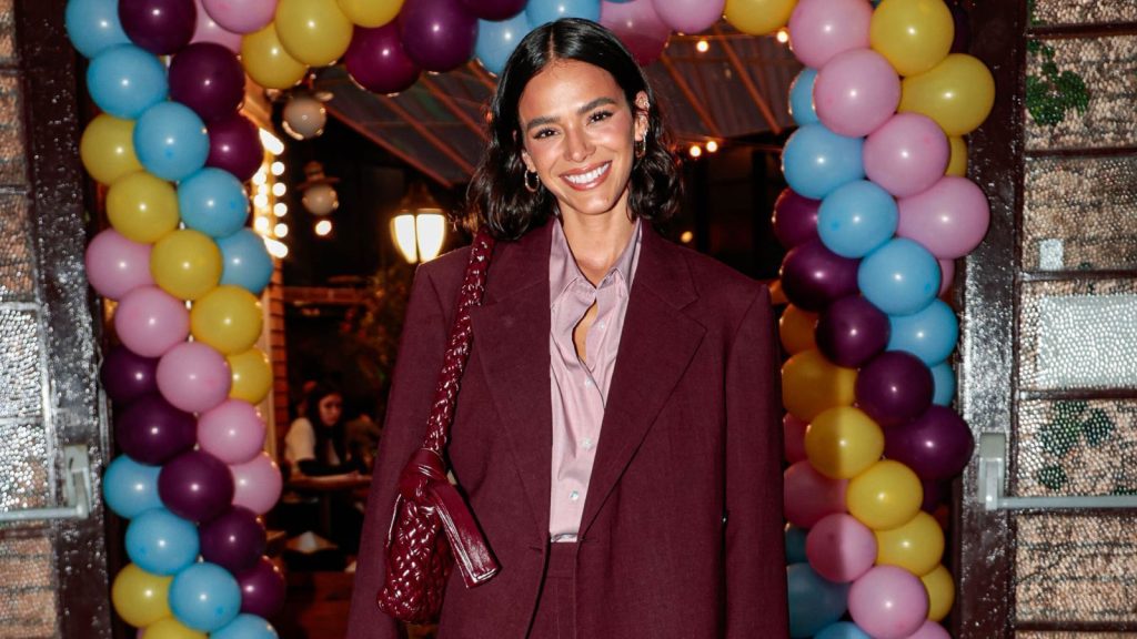 Acompanhada de João Guilherme, 22, Bruna optou por um terno completo, com modelagem oversized e em tom bordô. O look também foi acompanhado de uma camisa rosa, em que a gola foi mantida aberta.