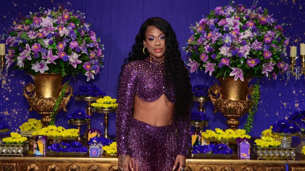 Já na comemoração, a pagodeira ousou com outra produção – desta vez toda roxa, com cropped de manga longa e saia.