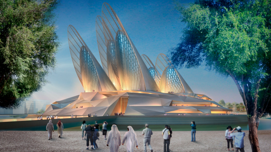 O Museu Nacional Zayed, que tem previsão de inauguração para 2025, tem no projeto de arquitetura estruturas que se assemelham a “asas”. As estruturas de aços funcionarão — além de formas de design — como “chaminés” térmicas sustentáveis.