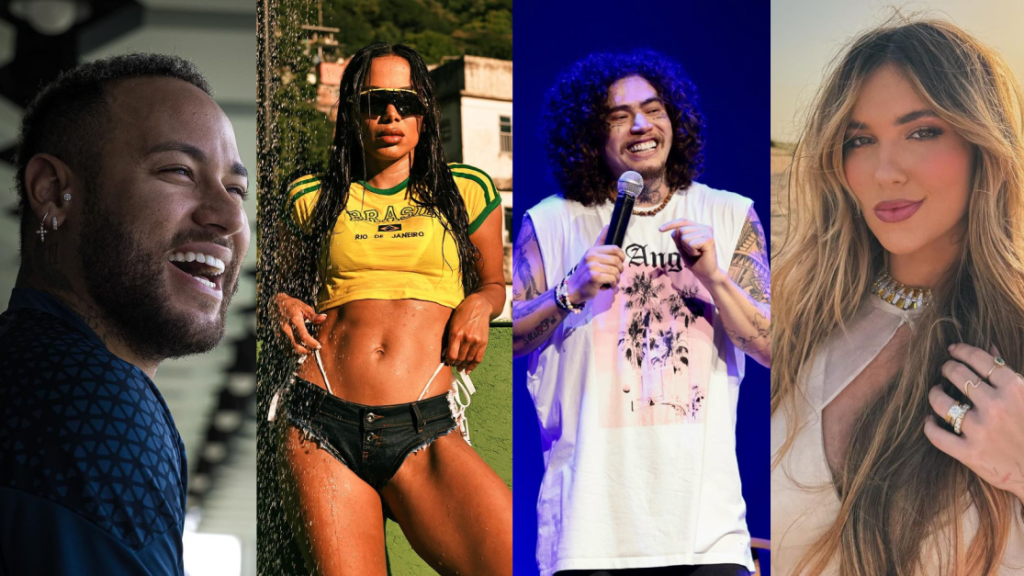 Entre elas, quatro são jogadores ou ex-jogadores de futebol — Neymar Jr, Ronaldinho Gaúcho, Vinicius Jr. e Marcelo Vieira — e dois músicos — Anitta e Zé Felipe. Em primeiro lugar, o atleta que joga no time do Al Hilal tem 221,5 milhões de seguidores no Instagram, 63 milhões no X e 32 milhões no Tiktok. Entretanto, a quantidade de fãs nas plataformas é apenas uma das métricas levadas em consideração para definição do ranking.