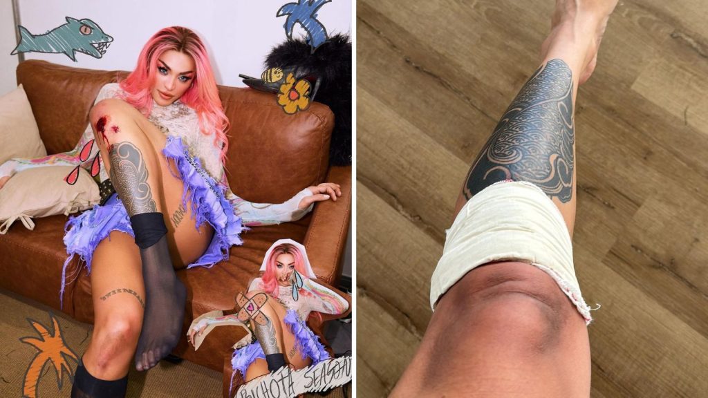 Na sequência de fotos publicadas em seu perfil no Instagram, a brasileira também mostrou os machucados após uma queda sofrida enquanto estava no palco.