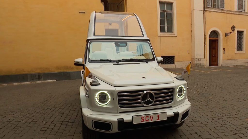 Entre os detalhes personalizados estão uma poltrona giratória e interiores feitos à mão. O veículo é baseado na nova Classe G elétrica com tração integral, projetado para a baixa velocidade habitual dos trajetos do papa na Praça São Pedro durante audiências públicas.