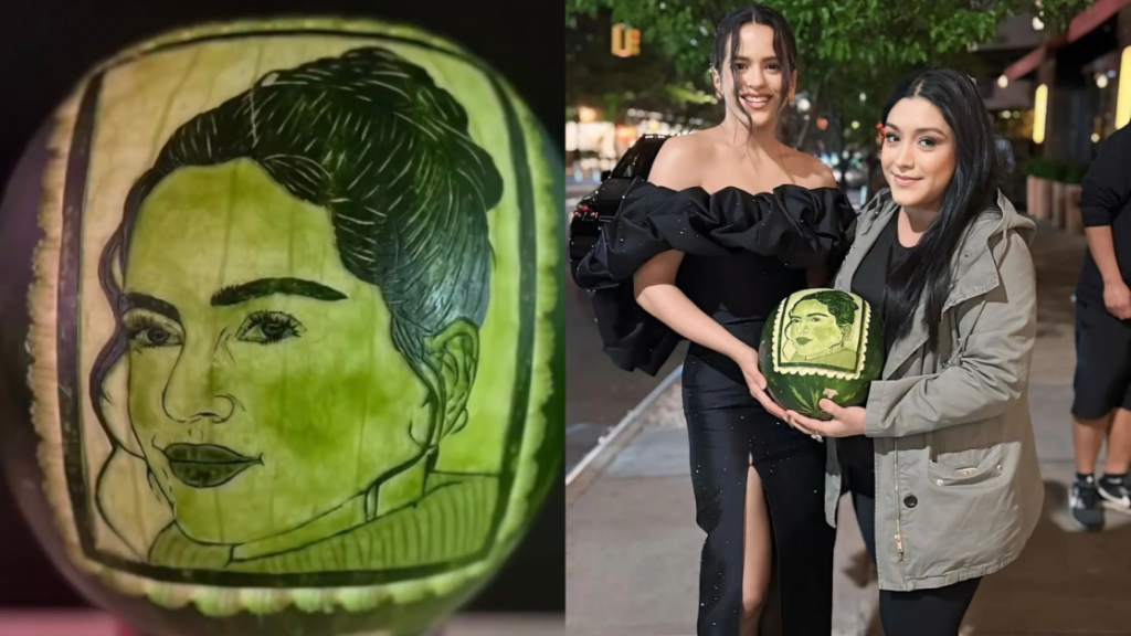 Rosalía ganhou, na quinta-feira (2), um presente inusitado: uma fã esculpiu o rosto da cantora espanhola em uma melancia e entregou de presente para a voz de “Despechá” e “Con Altura”.