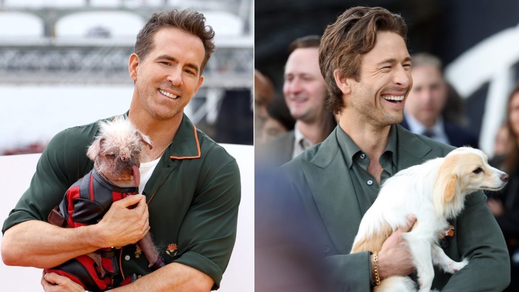 Ryan Renolds, 47, e Glen Powell, 35, tiveram a mesma ideia. Os dois atores levaram cachorros para as respectivas premières. Veja fotos acima.