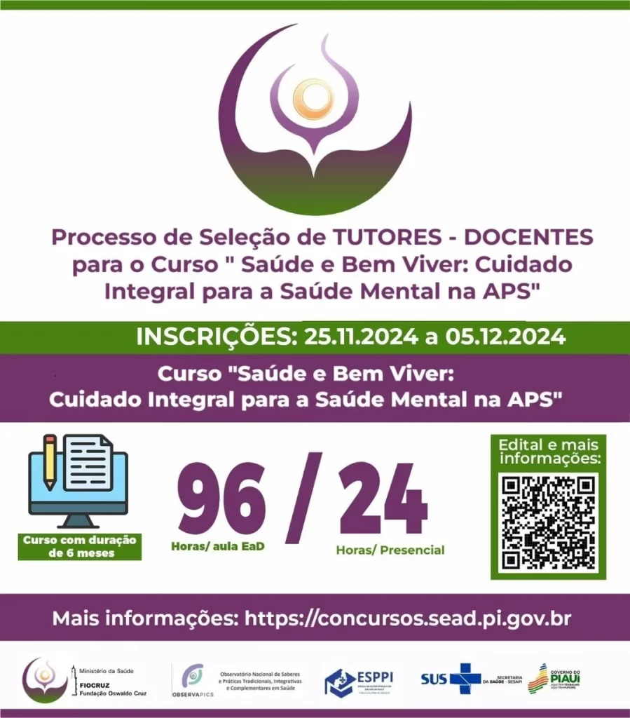 A Secretaria de Estado da Saúde do Piauí (Sesapi), em parceria com a Fiocruz, lançou edital para o processo seletivo que contratará 10 tutores para o curso “Saúde e Bem Viver: Cuidado Integral para a Saúde Mental na Atenção Primária à Saúde”. Os selecionados atuarão em regime de 20 horas semanais e receberão uma bolsa mensal de R$ 2.200,00.
