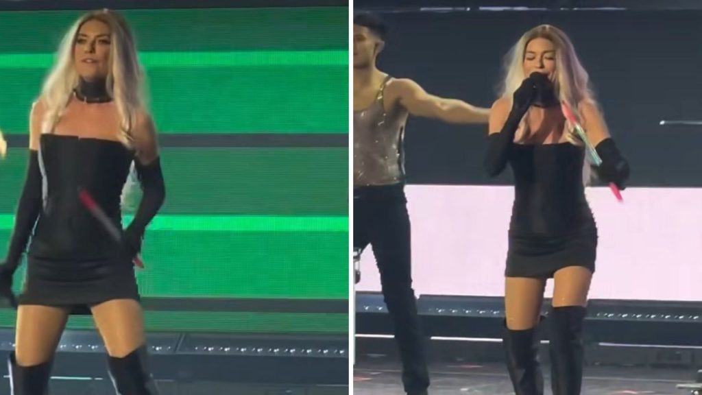 Nas imagens, que rapidamente viralizaram entre os internautas, a cantora soltava a voz ao som de “(If You’re Not in It for Love) I’m Outta Here!”, enquanto segurava um microfone com uma mão e, na outra, um bastão.