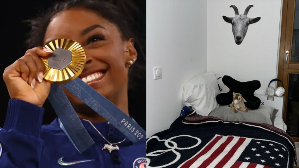 Após conquistar mais uma medalha de ouro, a ginasta Simone Biles, 27, decidiu compartilhar uma foto de seu quarto na Olimpíada de Paris. No local, a americana possui adornos de cabra: tanto uma decoração colada na parede, como uma pelúcia do animal (veja acima).
