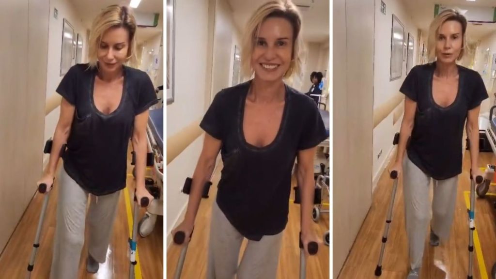 Paula Burlamaqui aparece de muletas após cirurgia no quadril