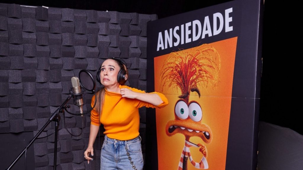 Para o longa, em que ela dá voz a Ansiedade, a humorista precisou usar uma caixa de equipamentos para ficar na altura do microfone.