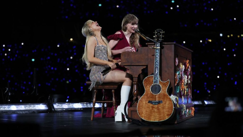 A cantora Taylor Swift, 34, celebrou, na quinta-feira (3), o fato de que a turnê de sua amiga, a também cantora Sabrina Carpenter, está com os ingressos todos esgotados.