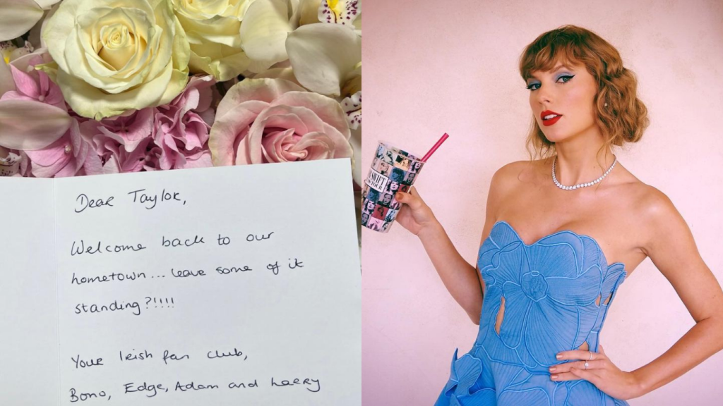 Taylor, por sua vez, compartilhou uma foto do presente em suas redes sociais e mencionou em sua legenda: “Já estou sentindo a hospitalidade irlandesa! U2, obrigada por sempre serem os mais elegantes e legais”.