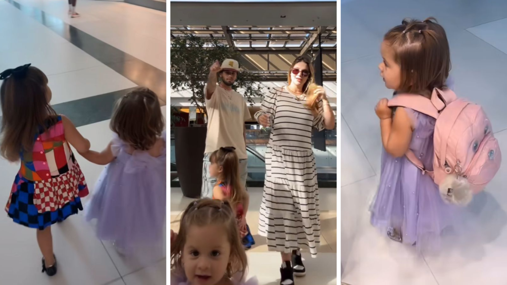 Antes de seguirem para a loja, a família dançou no local. As crianças também foram flagradas andando pelo shopping de mãos dadas. Elas logo foram recebidas pelas recepcionistas e provaram algumas mochilas. Em um certo momento, a primogênita do casal sai da loja e continua andando pelo shopping.