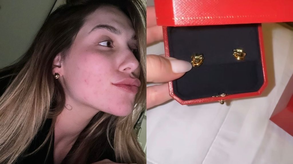 Em outro vídeo, a influenciadora apareceu já com o acessório em sua orelha e ressaltou mais qualidades de seu presente. “Olha que lindinho, gente. Ele é discreto, está vendo? Um brinquinho para usar no dia a dia, pequenininho, não pesa… amei”, disse.
