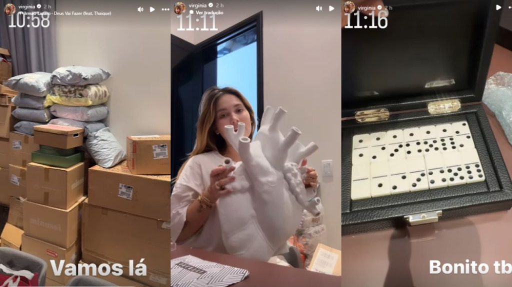 Nos vídeos, Virgínia mostra que fez tantas compras que nem se lembra de algumas delas. “Vou descobrir junto com vocês o que eu comprei, porque eu não me lembro”, diz. Uma das compras é um jogo de damas decorativo, com a base feita de mármore e peças douradas. “Alguém precisa me tirar de perto de mim”, escreveu na publicação. Também há um jogo de dominó com peças brancas.