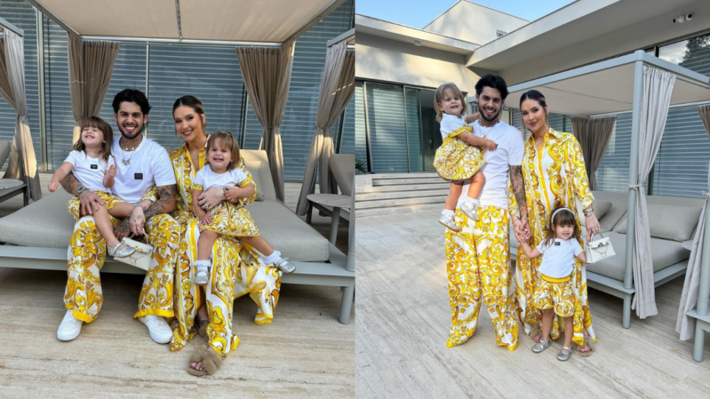 A influenciadora Virginia Fonseca, 25, e seu marido, o cantor Zé Felipe, 26, combinaram seus looks com as filhas para irem a um aniversário, nesta terça-feira (30). Ao lado de Maria Alice, 3, e Maria Flor, 1, a família elegeu modelitos com uma estampa amarela da Dolce & Gabbana (veja acima).