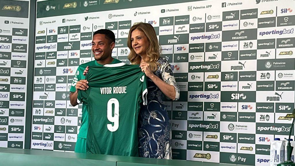 Vitor Roque foi apresentado oficialmente como reforço do Palmeiras na tarde desta sexta-feira (7). Na Academia de Futebol, o novo atacante foi anunciado, respondeu perguntas e vestiu a camisa de número 9 do Verdão.